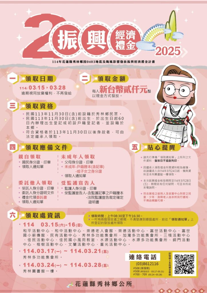 地方 振興部落經濟,秀林鄉振興經濟禮金2000元,3月15日-3月28日發放! 2025 年 2 月 25 日2025 年 3 月 3 日 qtai2022 領取日期:114.03.15至114.03.28領取金額:新台幣2,000元整(現金發放)領取時間:上午08:30至下午16:30 有氧報名點擊這裡 領取資格:民國113年11月30日(含)前設籍秀林鄉民眾。民國113年11月30日(含)前出生,於出生日起60日內辦理出生登記或初設戶籍登記者,並設籍於本鄉。符合資格者於113年11月30日以後身故者,可由法定繼承人領取。 應備文件:參照海報或官網計畫書發放地點:114.03.15~03.16 各村活動中心114.03.17~114.03.21 秀林多功能集會所114.03.24~114.03.28 秀林圖書館一樓連絡電話:03-8612116 #508(核發前)、#700、709(03.24~03.28) Share Facebook Twitter Pinterest Linkedin