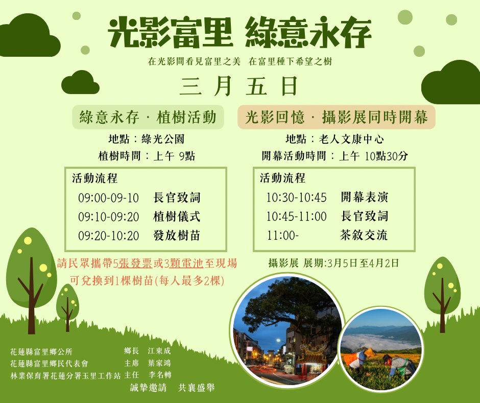 地方 文教 「光影富里 綠意永存」 邀您共創綠色家園! 2025 年 3 月 3 日2025 年 3 月 3 日 qtai2022 114年親子有氧線上報名連結 每年3月是植樹月,5日富里鄉公所、林業保育署花蓮分署玉里工作站及富里鄉民代表會,將共同辦理「光影富里 綠意永存」植樹活動,邀集富里鄉親們於綠光公園,種植紅花風鈴木,並贈送山櫻花、鐵冬青、桃金孃、山黃梔等樹苗,總計數百株。活動不僅響應植樹、環保愛地球的理念,也希望透過各村的參與,凝聚鄉親對家鄉的認同與對土地的熱愛 富里鄉長江東成表示,富里鄉公所一直致力於營造綠意盎然的生活環境,除了定期舉辦環境清潔活動,也積極推動公園綠美化。今年特別選定綠光公園種植紅花風鈴木,期待未來除了9月金針花季外,春分時節也能因盛開的紅花風鈴木吸引更多遊客造訪,為富里帶來更多人潮與商機,進一步提升地方經濟與旅遊發展。歡迎鄉親一同共襄盛舉,讓富里成為四季皆有美景的旅遊勝地! 活動當日民眾須自備環保袋,並可憑114年1-3月份紙本統一發票5張或廢電池3顆,兌換一株樹苗,每位鄉親最多可兌換2株。富里鄉公所誠摯邀請鄉親們參加植樹節活動,攜手為地球的未來盡一份力量。此外,當日上午10時30分於老人文康中心,將舉辦「光影富里 綠意永存」攝影展開幕,展期自3月5日至4月2日,透過影像呈現富里的自然景觀與人文風情,讓大家從不同角度感受家鄉之美。 Share Facebook Twitter Pinterest Linkedin