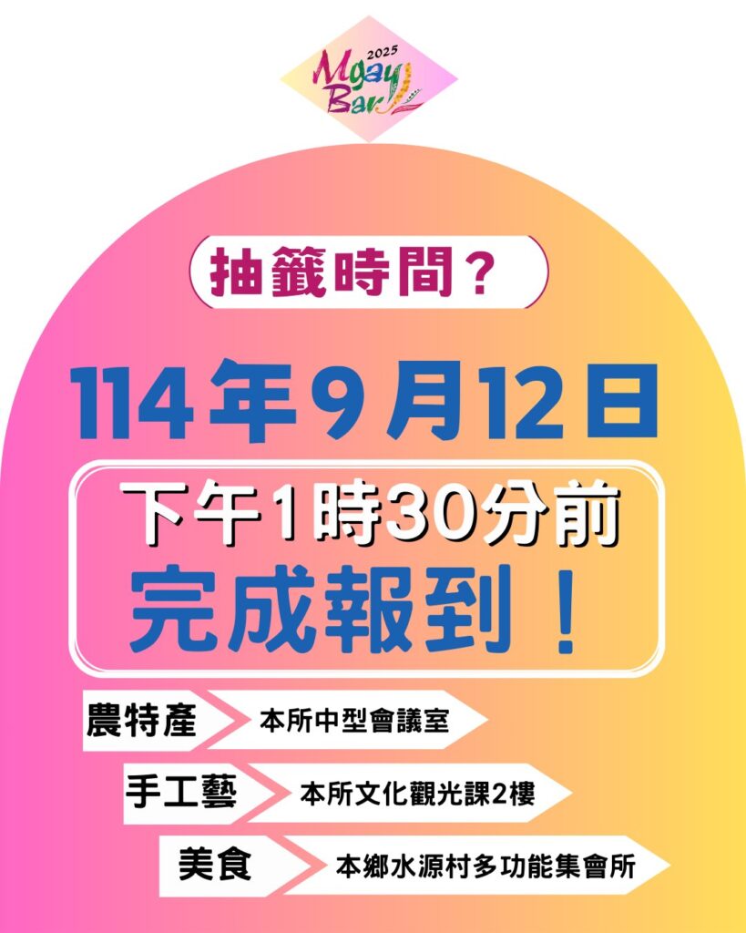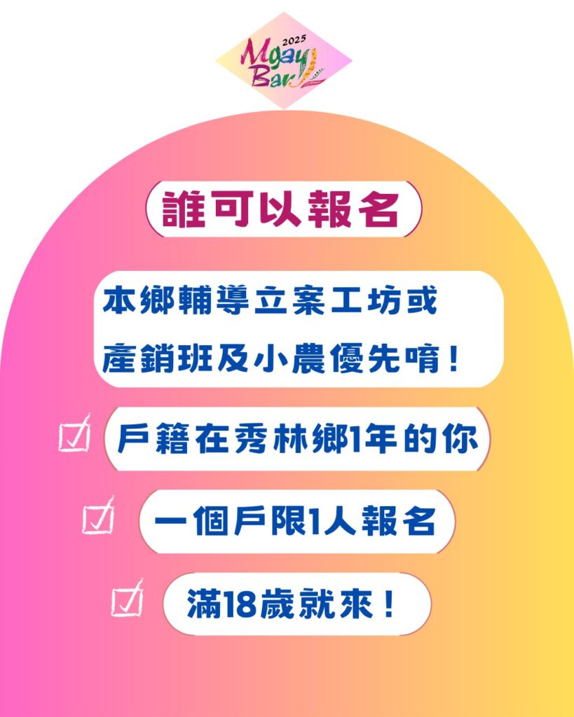 文教 產業 花蓮縣秀林鄉 2025 Truku Mgay Bari 感恩祈福文化系列活動招商開跑! 2025 年 8 月 21 日2025 年 8 月 26 日 qtai2022 活動地點:水源村東方夏威夷遊樂園舊址活動日期:•10/17(五)15:00–20:30•10/18(六)07:00–16:30 招商類別與名額•農特產展示售:10攤•手工藝品:16攤•美食攤:40攤(各村限4攤,超額抽籤,另有4攤邀請制)報名資訊•期間:8/20(三)~9/3(三)17:00 截止•地點:秀林鄉公所文化觀光課(紙本報名,資料不齊不受理) 抽籤說明會• 日期:9/12(五)14:00• 地點:水源村多功能集會所• 報到:當日下午13:30前完成,逾時視同放棄費用•保證金:2,000元(違規不退)•清潔費:300元 攤商規範重點•商品須具原住民文化特色•攤位提供帳棚1頂、桌2張、椅2張•不提供電源插座•攤商需全程在場,禁止轉讓攤位•環境清潔須確實,否則保證金不退 聯絡人•農特產:鍾小姐、葉小姐|分機523•手工藝品:盧小姐、江小姐|分機720、724•美食攤:冇納先生、高先生|分機718、725 03-8612116詳細招商簡章請見官網最新消https://www.shlin.gov.tw/mgaybarishop.htm Share Facebook Twitter Pinterest Linkedin