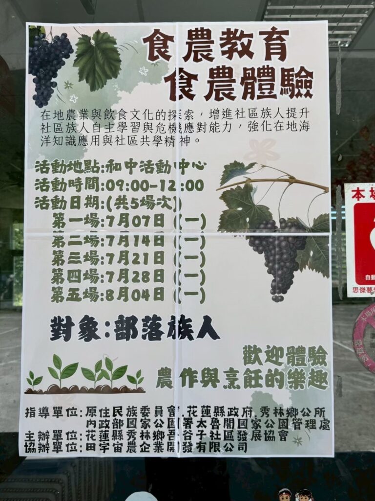 文教 產業 綜合 吾谷子部落食農教育暨生態保育宣導活動結訓嘍! 2025 年 10 月 2 日2025 年 10 月 7 日 qtai2022 為促進社區部落族人植農作物與健康知識,花蓮縣秀林鄉吾谷子社區發展協會(以下簡稱吾谷子社區發展協會)於8月21日在和中活動中心辦理辦理結訓活動,花蓮縣秀林鄉吾谷子社區發展協會理事長劉正凱、花蓮縣原住民行政處陳瑜芳專員等,皆一同到場參與活動。 花蓮縣秀林鄉吾谷子社區發展協會理事長劉正凱表示,早期和平村尚未土地開發時期,部落族人亦有種植農作物的習慣,然而時代的轉變,迫使部落族人漸漸遠離種植農作物的情況下,希望透過本次吾谷子部落食農教育暨生態保育宣導活動,鼓勵部落族人學習健康種植農作物與飲食知識,提升安全、營養食物的能力。 吾谷子社區發展協會劉正凱指出,期望藉由此次課程活動讓部落族人認識農業與食物來源,並且在了解食物從田間到餐桌的過程,認識在地農業與季節性作物。同時亦能強化地方認同與文化傳承。在這場具備在地文化食材、農耕活動與飲食文化的探索,建立對地方的認同感,強化社區族人對於山林保育基本認知。最後特別感謝田宇宙農企業開發有限公司、內政部國家公園署太魯閣國家公園管理處、原住民委員會、花蓮縣政府及秀林鄉公所,讓這場具備深度文化意涵與環境保護的課程能夠順利的完成。 Share Facebook Twitter Pinterest Linkedin