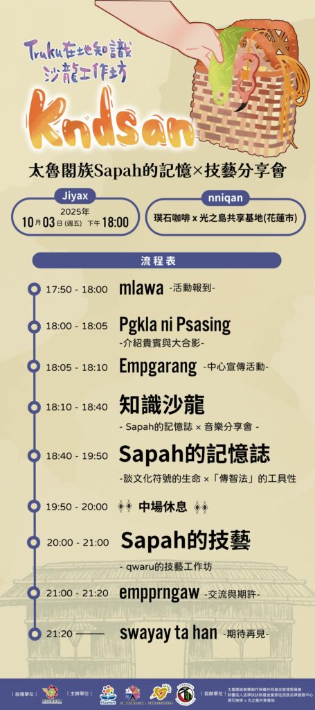 文教 產業 綜合 【太魯閣族Sapah的記憶 × 技藝分享會】10月3日璞石咖啡 x 光之島共享基地一起相見 2025 年 10 月 2 日2025 年 10 月 7 日 qtai2022 ── 文化 × 工藝 × 青年認同 的一夜對話 ── 活動時間|10/03(週五)晚上6:00 開始璞石咖啡 x 光之島共享基地(花蓮市明禮路8號)對太魯閣族人而言,Sapah(家)是一種生命經驗,也是一種文化的根。這場沙龍將從「技藝」出發,邀請當代太魯閣青年工藝師與創作者,分享他們如何在現代生活中,守護族群智慧、傳承傳統技藝、同時尋找自我認同。 講者陣容包含: Tadaw Masaw 李遠哲|太魯閣族青年纖維藝術師 Uhay Siqay 蘇貞汝|太魯閣族語創作樂團主唱Yubu Saysang 張亞伯|太魯閣族青年編織藝術師羅慧馨|財團法人法律扶助基金會 原住民族法律服務中心 專職律師太魯閣族智慧創作保護共同基金管理委員會 每一段故事,都是青年與文化相遇的真實足跡,透過不同的力量連結文化,成為記憶中的太魯閣族人,邀請您一起來聽聽他們的故事 。免費入場|提供餐點與飲品|參與回饋送精美禮品(貼心提醒:早點來卡位,座位有限喔!) Share Facebook Twitter Pinterest Linkedin