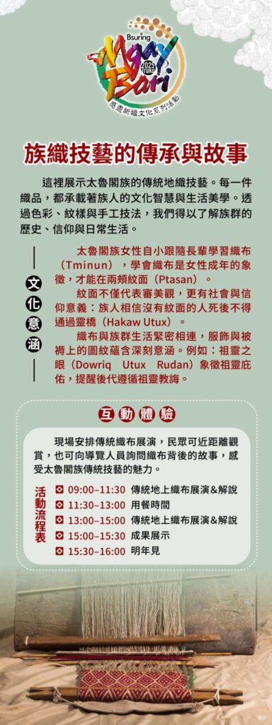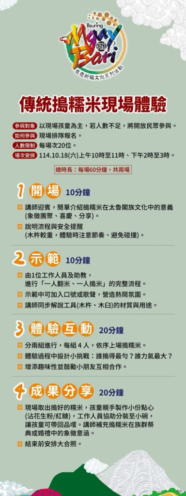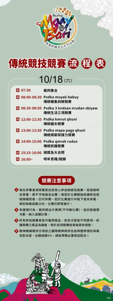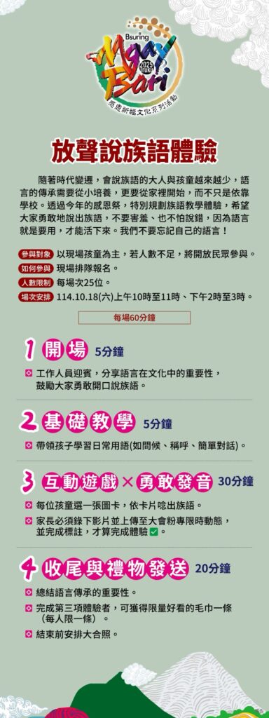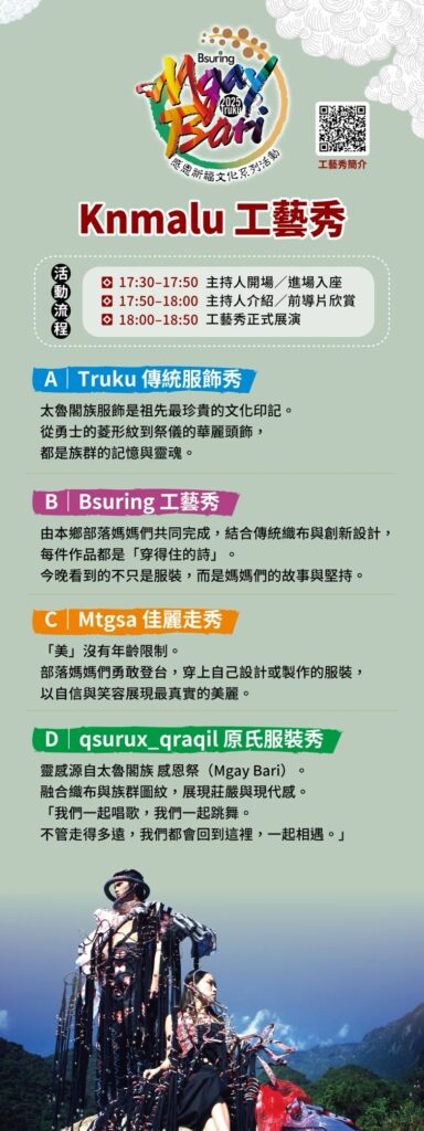 文教 太魯閣族年度盛事「2025 Truku Mgay Bari 感恩祈福文化活動」盛大登場 2025 年 10 月 13 日2025 年 11 月 24 日 qtai2022 花蓮縣秀林鄉太魯閣族年度最重要的文化盛事「2025Truku Mgay Bari 感恩祈福文化活動」即將於17 日至18 日在花蓮縣秀林鄉水源村東方夏威夷舊址盛大舉行。今年主辦單位特別規劃為期兩天的系列文化活動,結合傳統與創新,邀請族人與社會大眾共同參與,感受太魯閣族的文化脈動與傳承精神。 秀林鄉鄉長王玫瑰表示「Mgay Bari 活動不僅是歲時祭儀的展現,更是太魯閣族文化傳承的重要平台。多年來透過不同形式的舉辦方式,如2020 年的南北區分開辦理、2021 年典範部落模式,以及2022 至2024 年九村十二校十八部落共辦模式,展現部落自主性與文化多樣性。今年更期望透過豐富多元的文化活動,讓年輕世代深入認識太魯閣族的智慧與生活方式。」。 活動將於17 日(五)下午3 時在東方夏威夷遊樂園舊址率先登場,舉辦Knmalu 工藝秀暨音樂市集晚會,透過融合傳統工藝與現代設計的時尚展演,呈現太魯閣族服飾美學。現場同時設有音樂市集,邀請原住民族在線藝人及音樂人熱情演出,並活絡部落經濟,也為隔日的傳統祭典暖場造勢。本次活動的重頭戲Mgay Bari 感恩祈福文化祭典,將於18 日(六)凌晨4 時在同一場地舉行。透過祭典儀式、文化體驗與傳統技藝展示,帶領族人與參與者回顧歷史記憶,重拾文化根源,強化身份認同,深具意義。 本次活動地點選在歷史悠久的東方夏威夷遊樂園舊址,不僅象徵「傳承與再現」,更具有深耕文化、開創未來的期盼。該地為鄉內公有原住民保留地,秀林鄉公所在有限財源下已完成地上物拆除與綠美化作業,打造友善活動場域。 Share Facebook Twitter Pinterest Linkedin