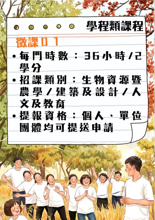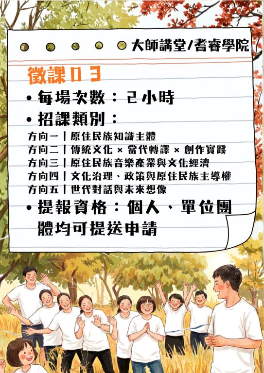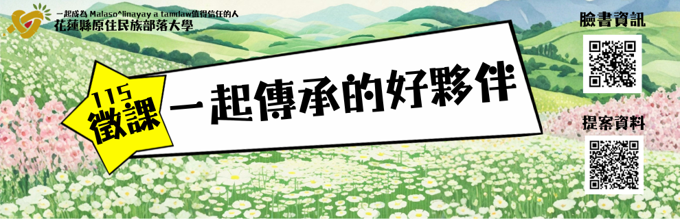 文教 產業 綜合 花蓮縣原住民族部落大學 115 年度課程徵集公告 2026 年 1 月 13 日2026 年 1 月 16 日 qtai2022 花蓮縣原住民族部落大學秉持「以原住民族為主體的學習精神」,持續推動文化傳承、知識累積與行動實踐,期透過課程開設,陪伴部落、族人及社會大眾,逐步累積可被信任、可被依靠的學習力量。誠摯邀請關心原住民族文化、教育與未來發展之個人及團體踴躍提案,共同成為文化傳承與知識實踐的重要夥伴。 一、課程徵集類型(一)學程類課程每門課程 36 小時,核給 2 學分。招課領域包含:生物資源暨農學、建築及設計、人文及教育等相關領域。(二)研習類課程每門課程 36 小時,核給 2 學分。招課領域包含:傳統文化領域、智慧創新領域等相關主題。(三)大師講堂/耆睿學院每場次 2 小時,聚焦以下五大方向:原住民族知識主體傳統文化結合當代轉譯與創作實踐原住民族音樂產業與文化經濟文化治理、政策發展與原住民族主導權世代對話與未來想像 二、提報資格凡具備相關專業或實務經驗之個人、團體、工作室或單位,皆可提出課程申請。三、徵集期間即日起至 115 年 2 月 2 日(星期一)止。四、提案流程線上提報 → 資料送件 → 承辦單位初審 → 面報審查 → 預計 3 月公告審查結果。線上提報網址:https://reurl.cc/MMg7e4詳細徵課資訊請參閱圖卡 QR Code。 Share Facebook Twitter Pinterest Linkedin