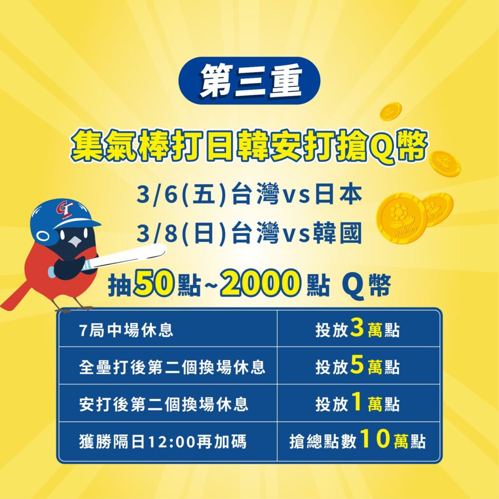 最新消息 體育 為中華隊加油 花蓮縣政府推出花蓮Q幣三重送 WBC經典賽直播在花蓮 2026 年 3 月 4 日2026 年 3 月 4 日 qtai2022 世界棒球經典賽(World Baseball Classic,WBC)熱血開打,中華隊迎戰各國強敵。花蓮縣政府號召全縣鄉親齊心應援,在山海之間同步為中華隊加油,並結合「花蓮好Q」平台推出「花蓮Q幣三重送」活動,邀請民眾球賽應援拿Q幣(1點=1元),共同感受熱血賽事氛圍。 縣府表示,本次活動透過線上線下整合方式,讓鄉親不僅能在縣內三地同步觀賞直播,為中華隊加油,更能獲得限量花蓮Q幣(1點=1元),可於花蓮合作店家使用,活絡在地經濟。<第一重>分享留言送Q幣民眾只要在「花蓮縣政府粉專」分享指定FB貼文(3月4日)並留言「#花蓮應援中華隊 」,即可獲得10點Q幣,限量100組,符合資格者將由小編私訊提供。 <第二重>限時幸運轉輪搶Q幣3月4日(三)、3月5日(四)連續兩天中午12時開放搶Q幣活動,每日2000組、每組5點Q幣,數量有限,送完為止。<第三重>集氣棒打日韓 安打搶Q幣3月6日(五)台灣對戰日本、3月8日(日)台灣對戰韓國兩場焦點賽事,將依比賽關鍵時刻投放Q幣,抽50點~2000點,包括: 7局中場休息投放3萬點、全壘打、安打後第二個換場休息投放5萬點、1萬點;若中華隊獲勝,隔日中午12時再加碼投放總點數10萬點,讓球迷在關鍵時刻同步搶Q幣、為中華隊集氣應援。花蓮賽事直播場地,3月5日(四)至3月8日(日)賽事期間,縣府規劃三區應援直播「花蓮縣棒球賽事直播派對」,包括北區花蓮市東大門夜市共融廣場、中區光復鄉公所前廣場,以及南區玉里鎮藝文中心,邀請鄉親為中華隊加油。 花蓮縣政府誠摯邀請鄉親先至「花蓮好Q」平台註冊,一起為中華隊集氣,也為花蓮城市注入更多熱情與活力。花蓮縣政府強調,透過限量Q幣活動,持續關注中華隊賽事,讓花蓮成為全台最熱血的應援城市,與中華隊並肩作戰,共同迎向勝利。花蓮好Q平台:(建議以手機開啟)https://portal.hualien.citycoins.cc/ Share Facebook Twitter Pinterest Linkedin